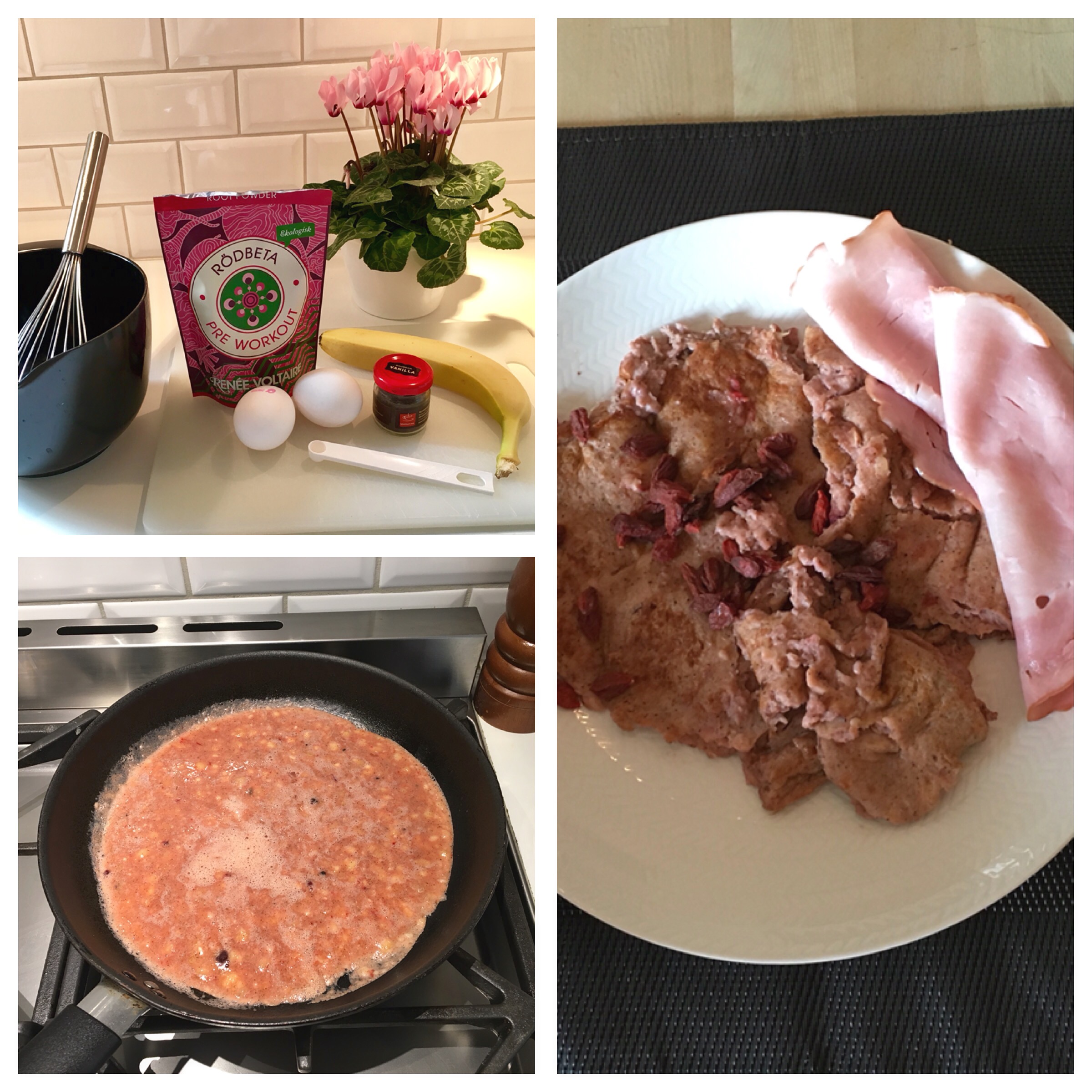 Jag har lagat banan pannkakor med rödbeta pulver från Renée Voltaire som gett pannkakorna (eller omeletten) den rosa fina färgen. Se mitt recept nedan och njut till brunchen eller mellanmålet!