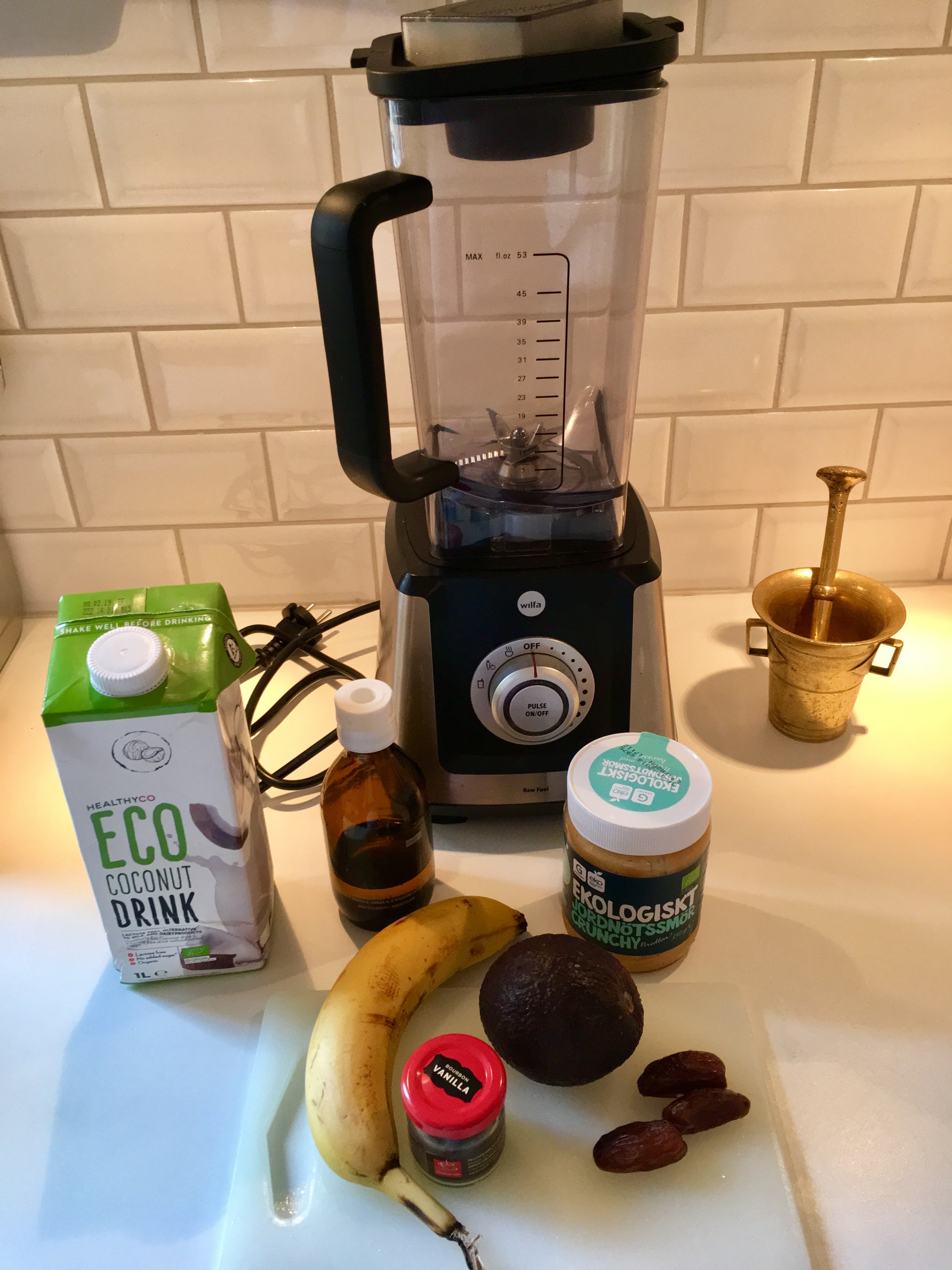 Jag delar på dadlarna i mindre bitar samt skivar bananen och avokadon och lägger allt tillsammans i en mixer. Jag blandar ned resten av ingredienserna och får 2 jättegoda smoothies! 🍹