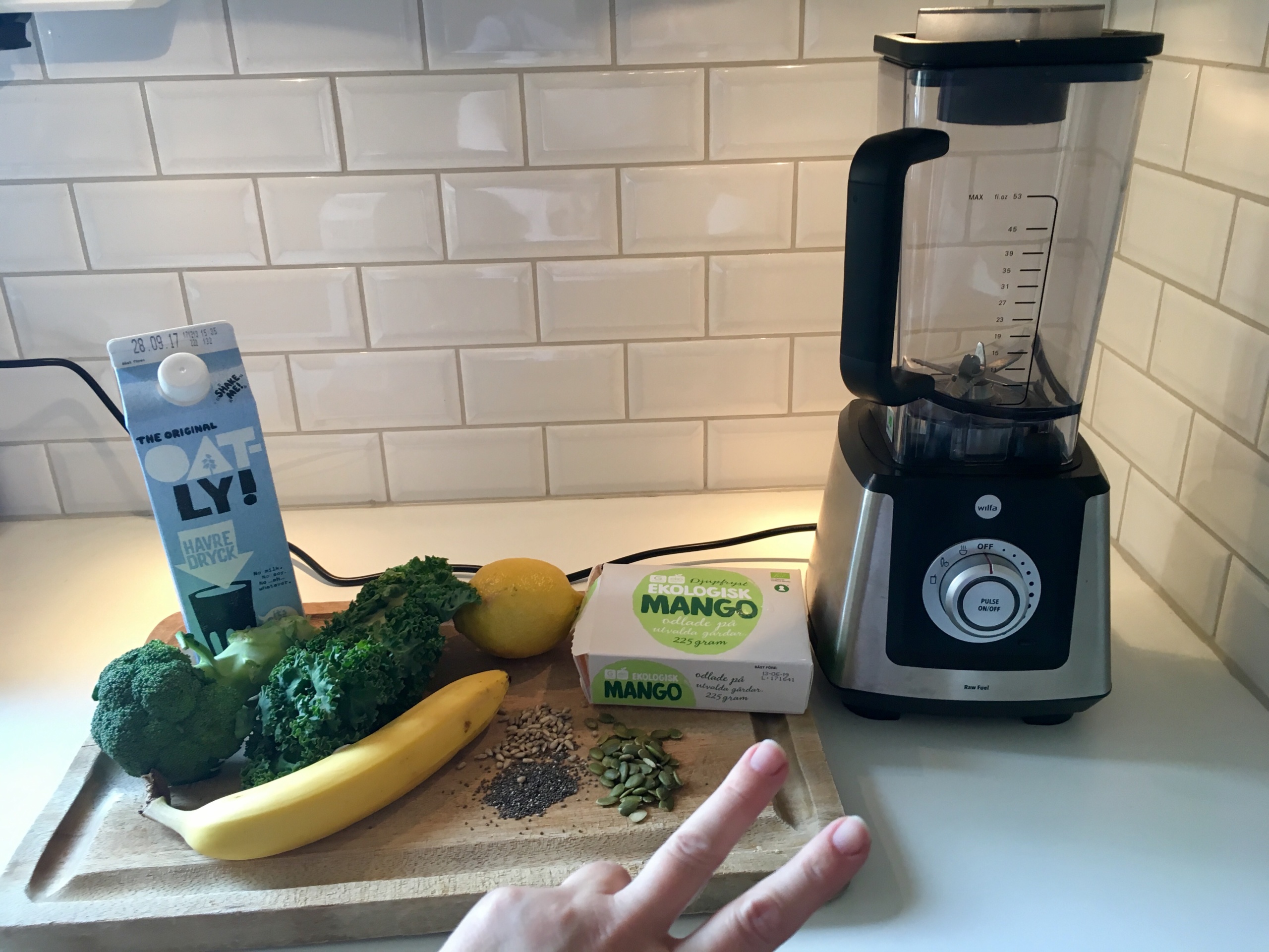 Till mig och min man brukar jag blanda ned allt grönt jag har hemma (typ grönkål, broccoli, spenatsallad, avokado etc) med något ”sött” som banan, fryst mango eller blå bär samt lite citron. Jag blandar även ned de frön jag har hemma (lite chiafrön, hampafrön, pumpakärnor och/eller solrosfrön). Avslutningsvis blandar jag ned ett glas vatten och 1 dl havremjölk. Jag kör allt i mixern för att sedan avnjuta tillsammans med min man! (2 glas)